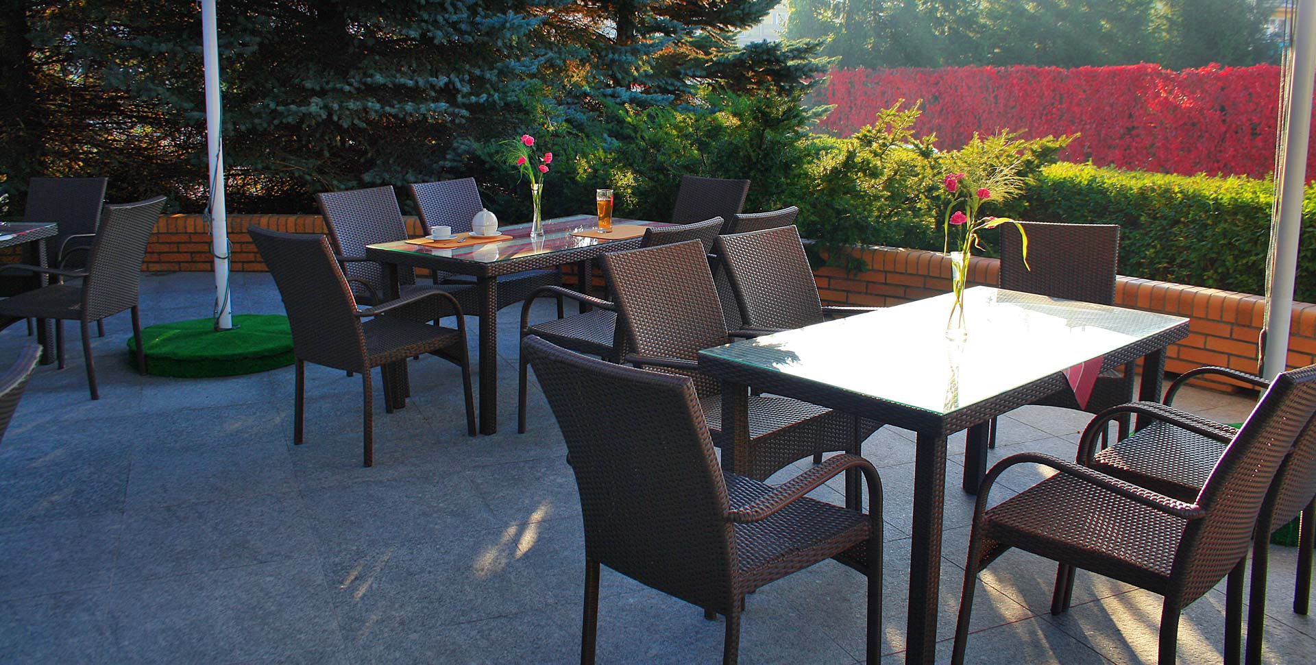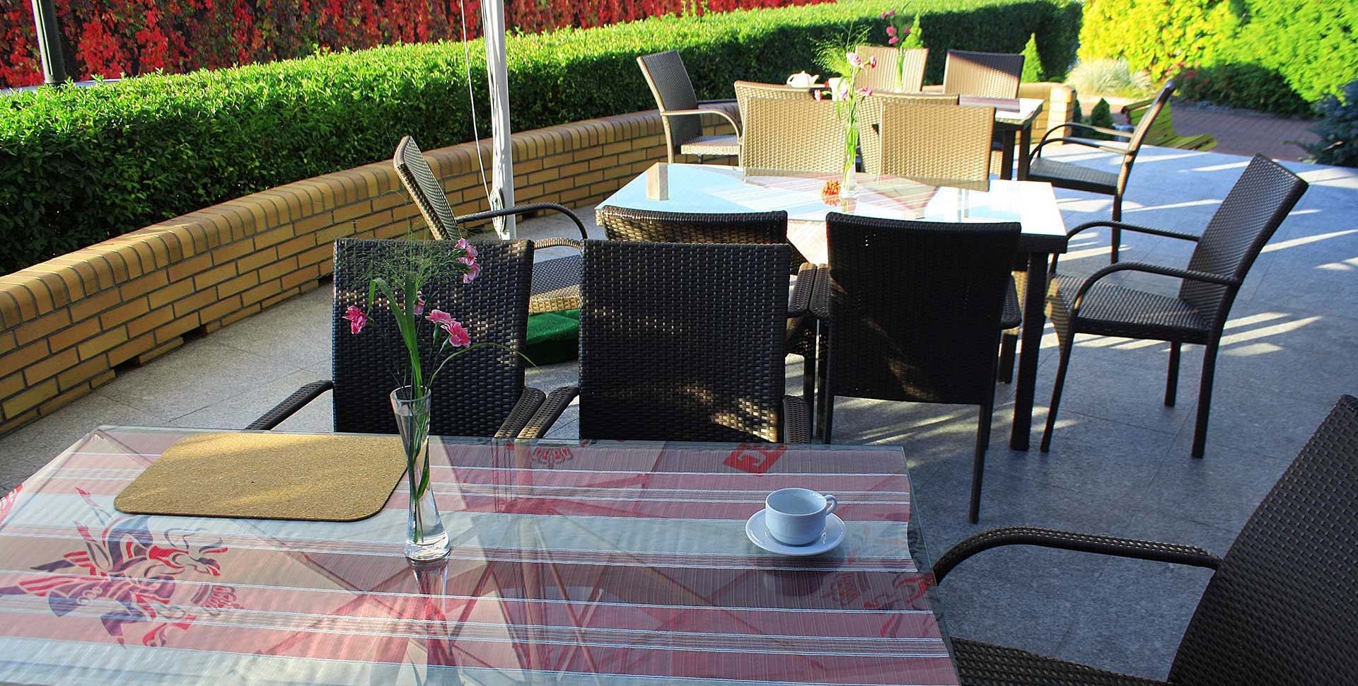 terasos kaimynystėje esančio restorano su oro kondicionieriumi interjeras kviečia organizuoti: